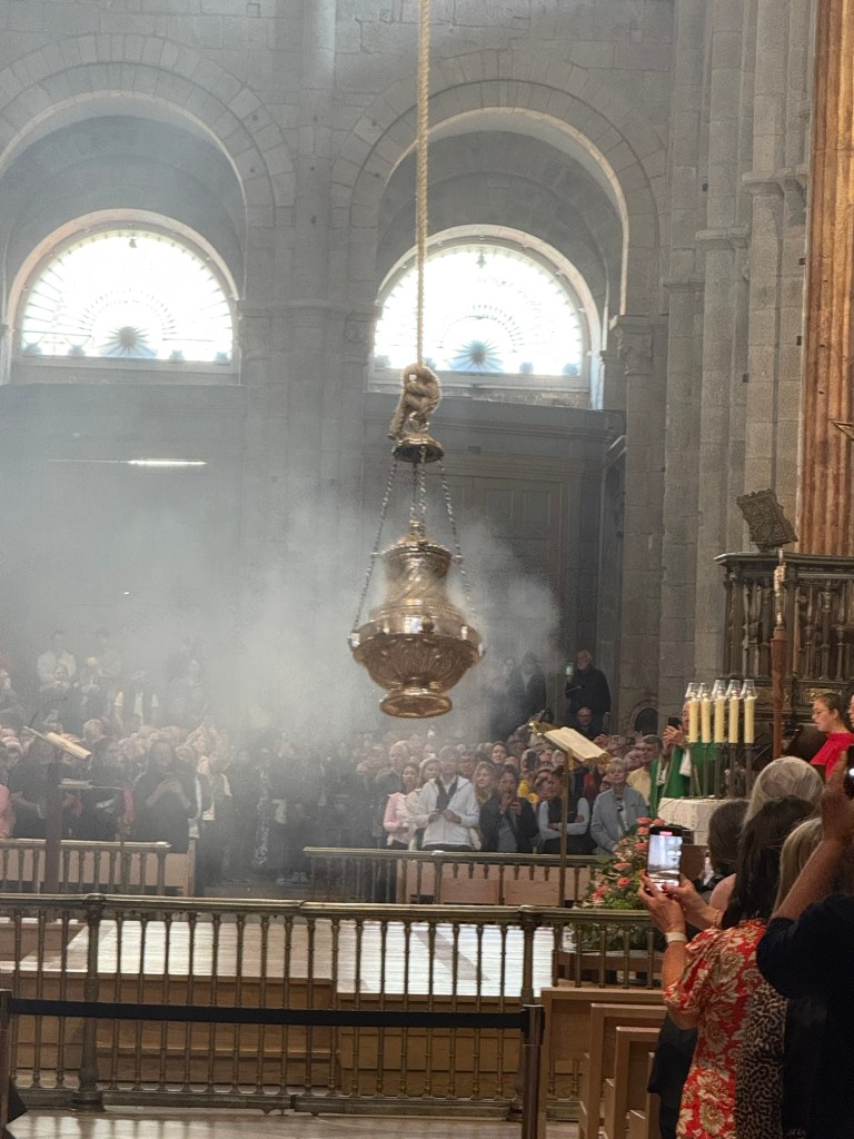 I had heard today’s mass had some importance because there were 7 priests from other countries co-celebrating the mass. That meant they included the botafumeiro at the end. The botafumeiro is a giant incense burner that is suspended from the top of the cathedral ceiling and swings over the people, hoisted by 6 or 8 priests. It’s kind of crazy and it’s something that isn’t done regularly—there’s no official schedule. Camino pilgrims hope to get lucky—and I was lucky to see it! (I’ve shown Paul videos and he always laughs because it looks crazy, like not safe at all lol.)